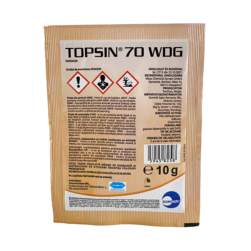 Topsin 70 WDG este un fungicid sistemic cu actiune preventiva si curativa, folosit pentru tratarea si protejarea culturilor agricole impotriva bolilor.